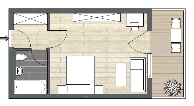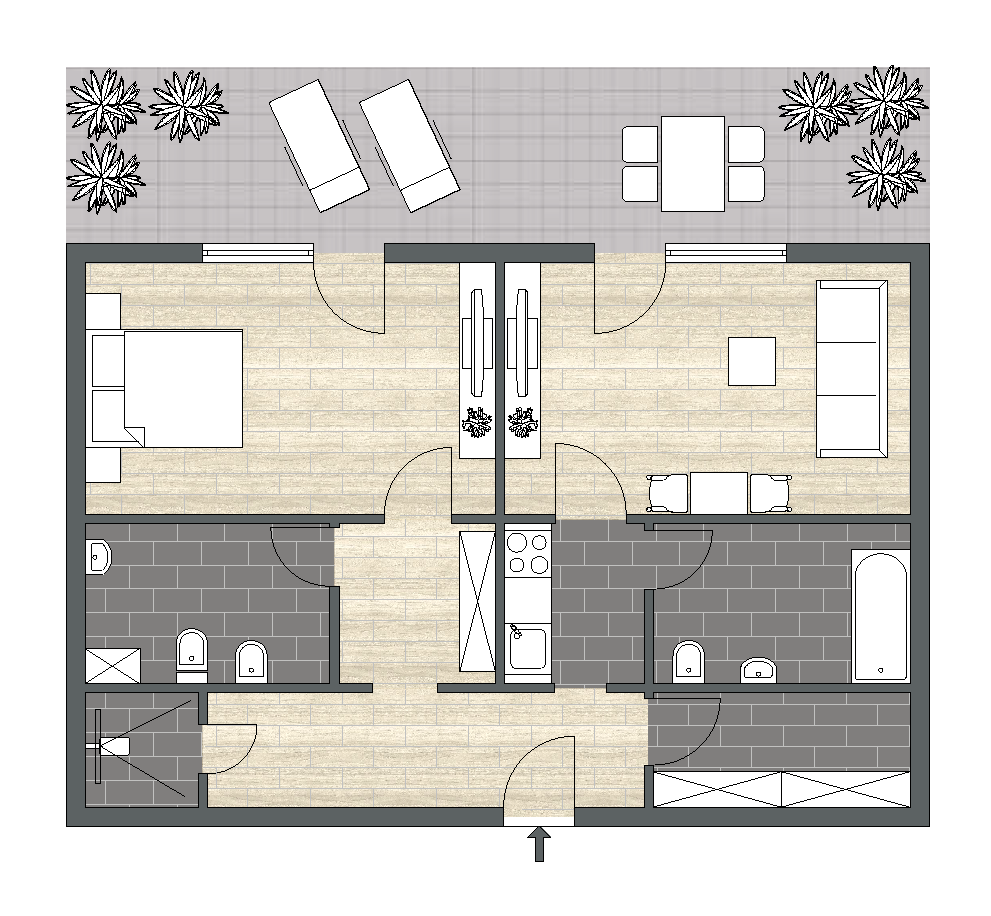 • „Terrasse außen“ bedeutet, dass jedes Zimmer einen kleinen eingezäunten Bereich (ca. 40 qm) hat.