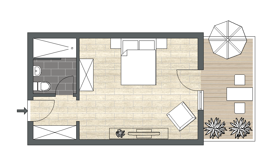 Das Besondere an diesen Zimmern ist die Terrasse mit Zugang zum Gemeinschaftsgarten. Hier könnt ihr die frische Luft genießen und euch inmitten der grünen Umgebung entspannen. Der Gemeinschaftsgarten bietet den Gästen von insgesamt sieben Zimmern die Möglichkeit, sich zu treffen, sich auszutauschen und gemeinsam schöne Momente zu verbringen.